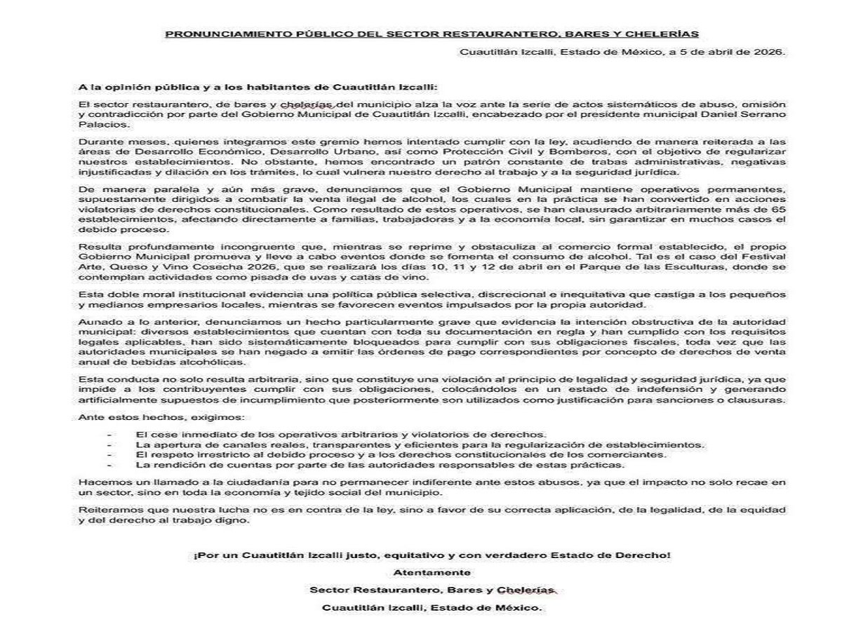Cuautitlán Izcalli, Estado de México a 6 de abril de 2026. Integrantes del sector restaurantero, bares y chelerías en Cuautitlán…